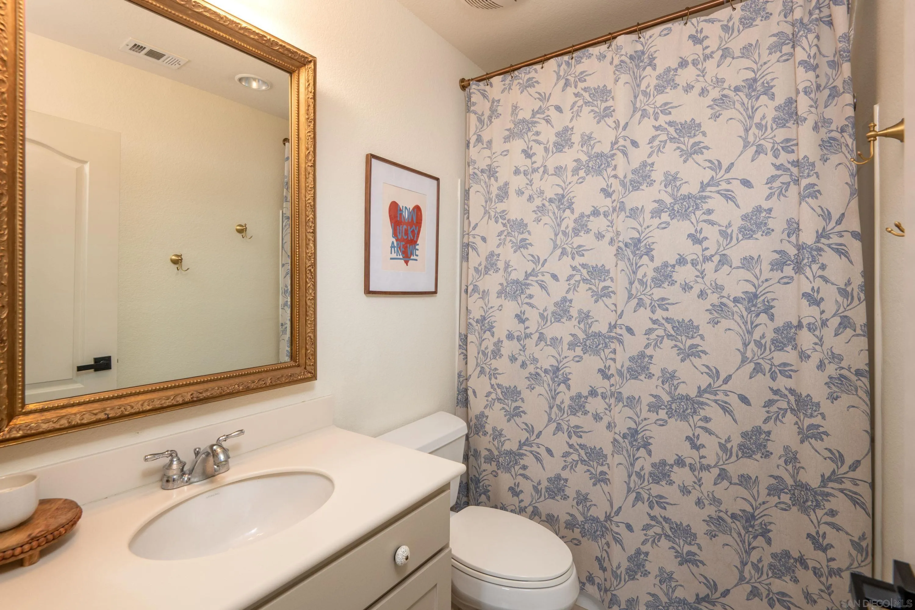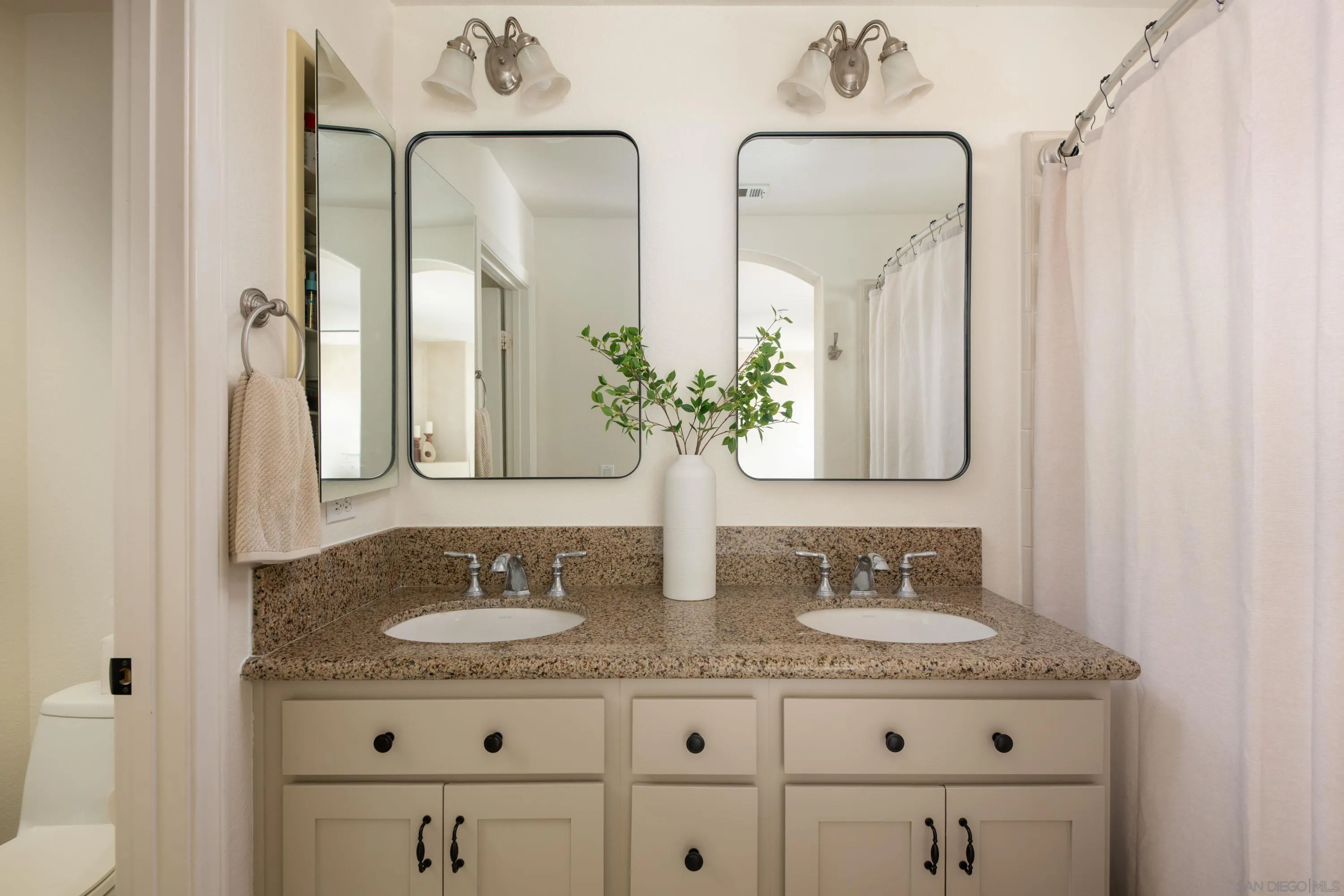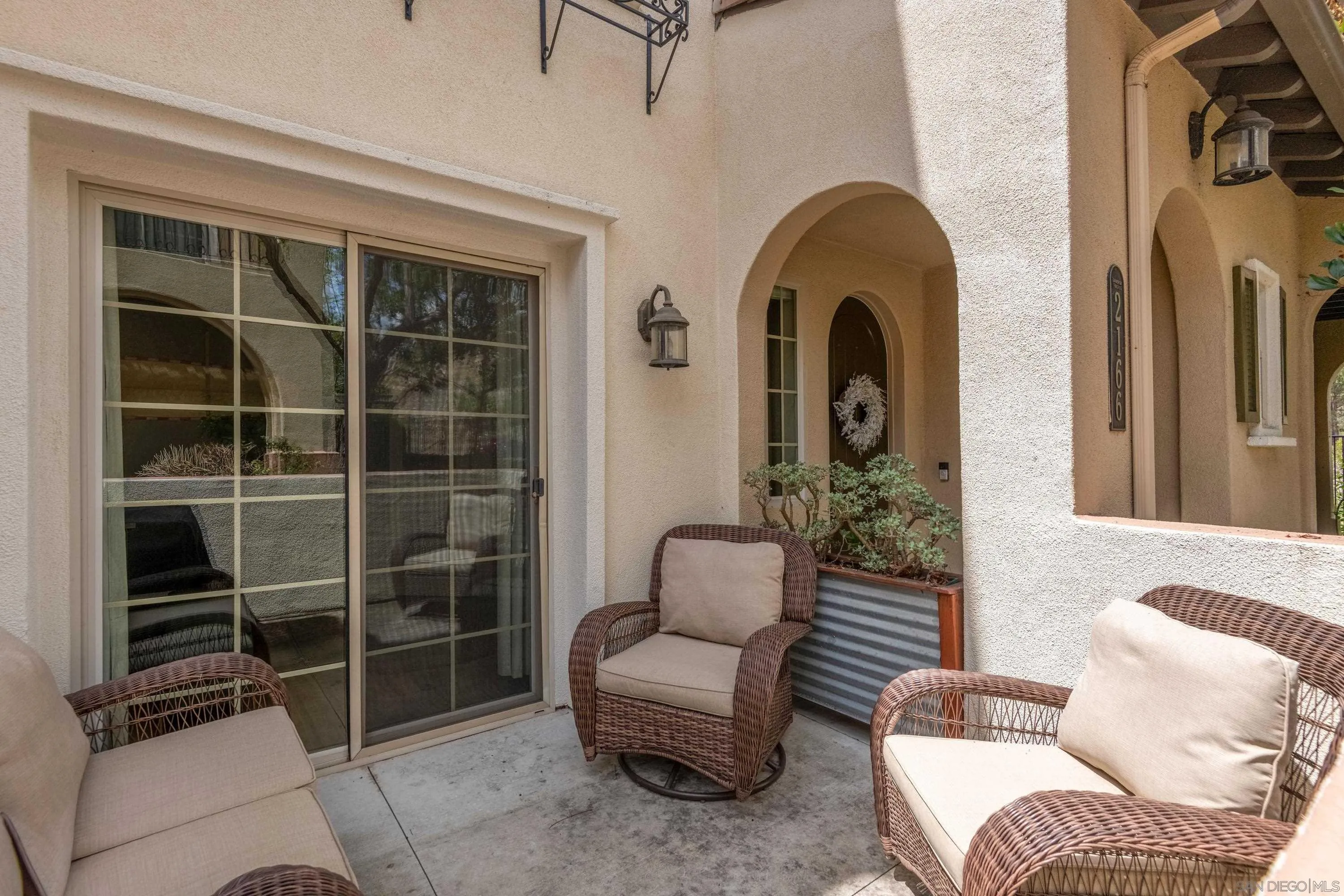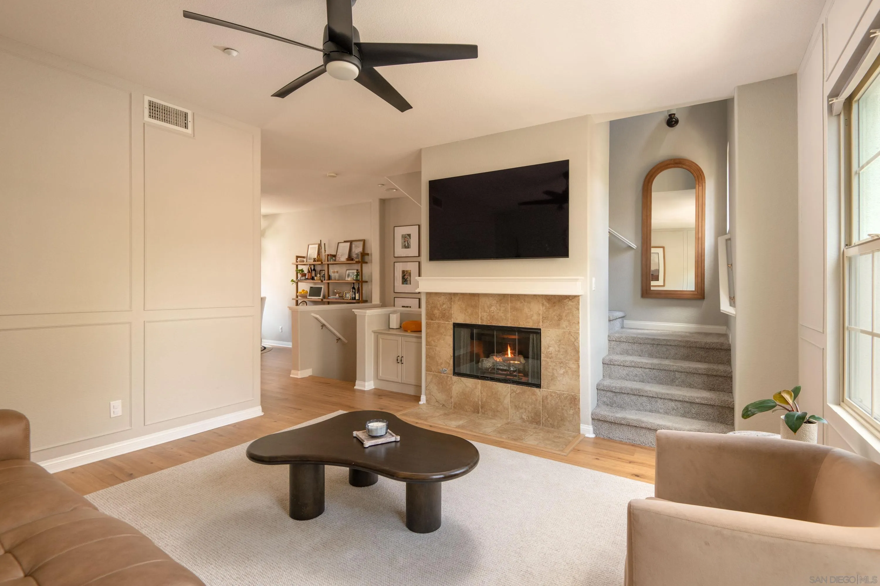 Welcome to your beautifully updated and peaceful townhome in Larkspur Heights, where natural light and thoughtful upgrades create a warm, inviting place to call home. The flexible floor plan offers an optional 3rd bedroom on the entry level with french doors and access to a private patio, a quiet and comfortable space perfect for guests or a home office. Upstairs, two bedrooms each feature an ensuite bathroom. This primary suite is serene with lime-washed walls that add soft texture and a calming feel. The kitchen has been tastefully updated with painted cabinetry, new fixtures, a new sink and faucet, a new refrigerator and microwave. The living room is comfortable and elevated, with added molding, sconces, a built-in entertainment cabinet, and a new fan that tie the space together. Upgrades throughout include new flooring, a remodeled powder room with new vanity, mirror, lighting; added trim details, and new hardware on all interior doors; and a digital entry door handle. Additional features include in-unit laundry and a two-car attached garage with direct access. Residents enjoy a well-maintained community with a pool, BBQ area, and park. Located within the top-rated San Marcos Unified School District, including Carrillo Elementary, San Elijo Middle School, and San Marcos High School.