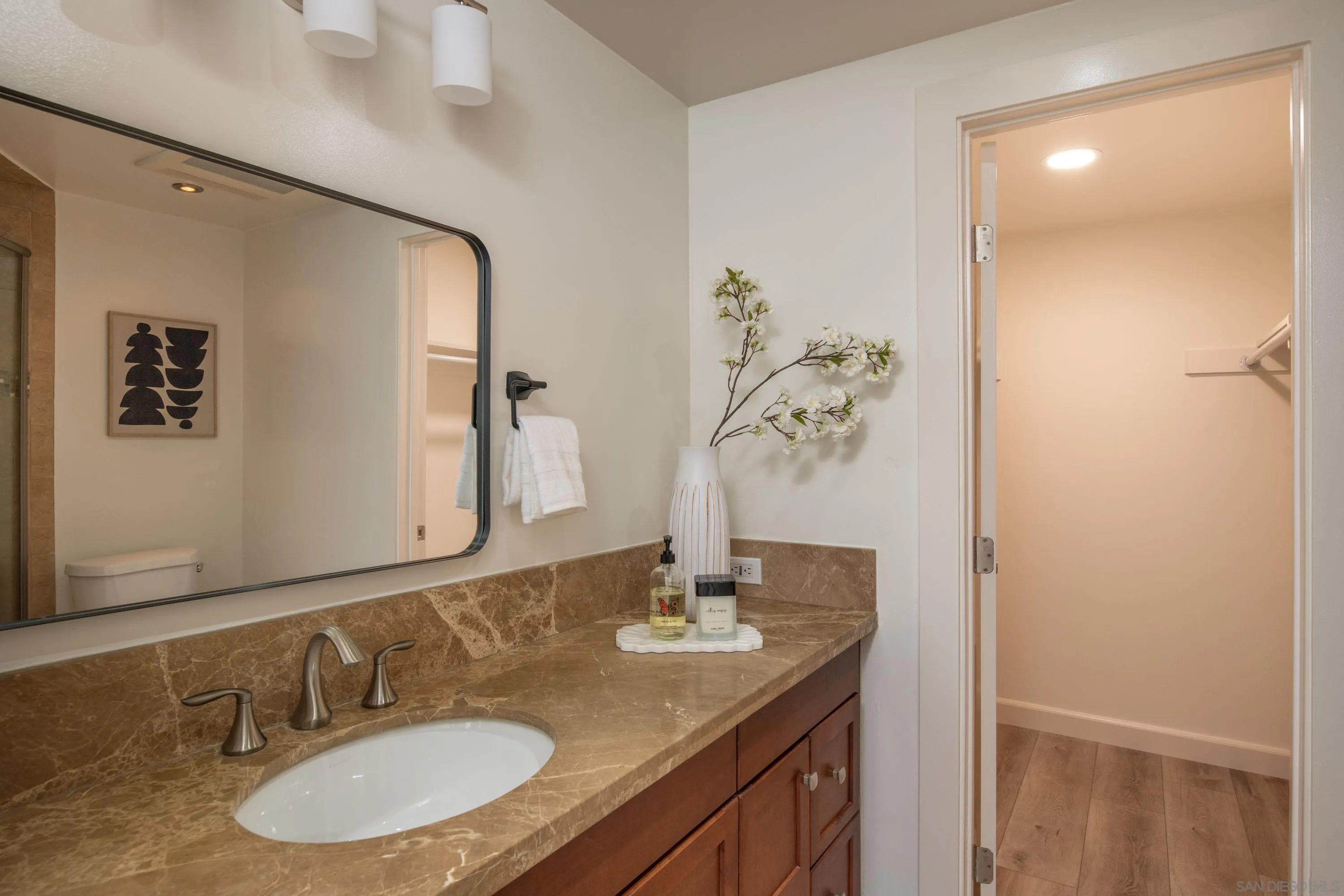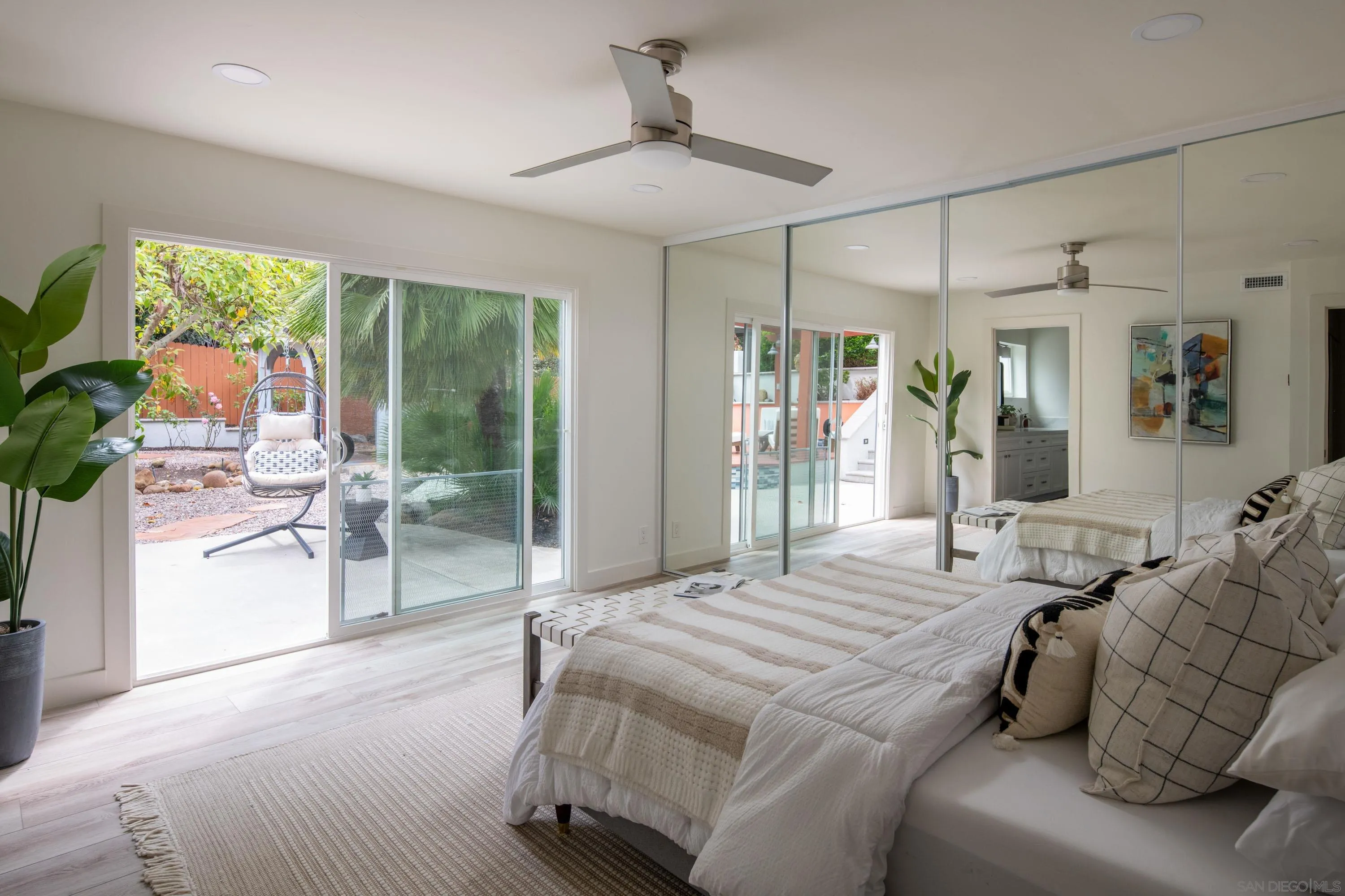 Beautifully upgraded 4-bedroom, 3-bath home featuring dual primary suites and a blend of modern updates and functional living. This move-in-ready property includes a new HVAC system, updated plumbing, new LVP flooring, and fully owned solar with two batteries and an EV charger for added efficiency. The second primary suite offers its own private entrance, ideal for guests, extended family, or added flexibility. The main primary suite includes a bonus space perfect for a home office or sitting area. The private, multi-level backyard is designed for both everyday living and entertaining, complete with a built-in BBQ, in-ground spa, low-maintenance turf, and mature landscaping featuring 10+ fruit-producing trees. Prime location near Lake Murray with convenient access to shopping, dining, and outdoor recreation.